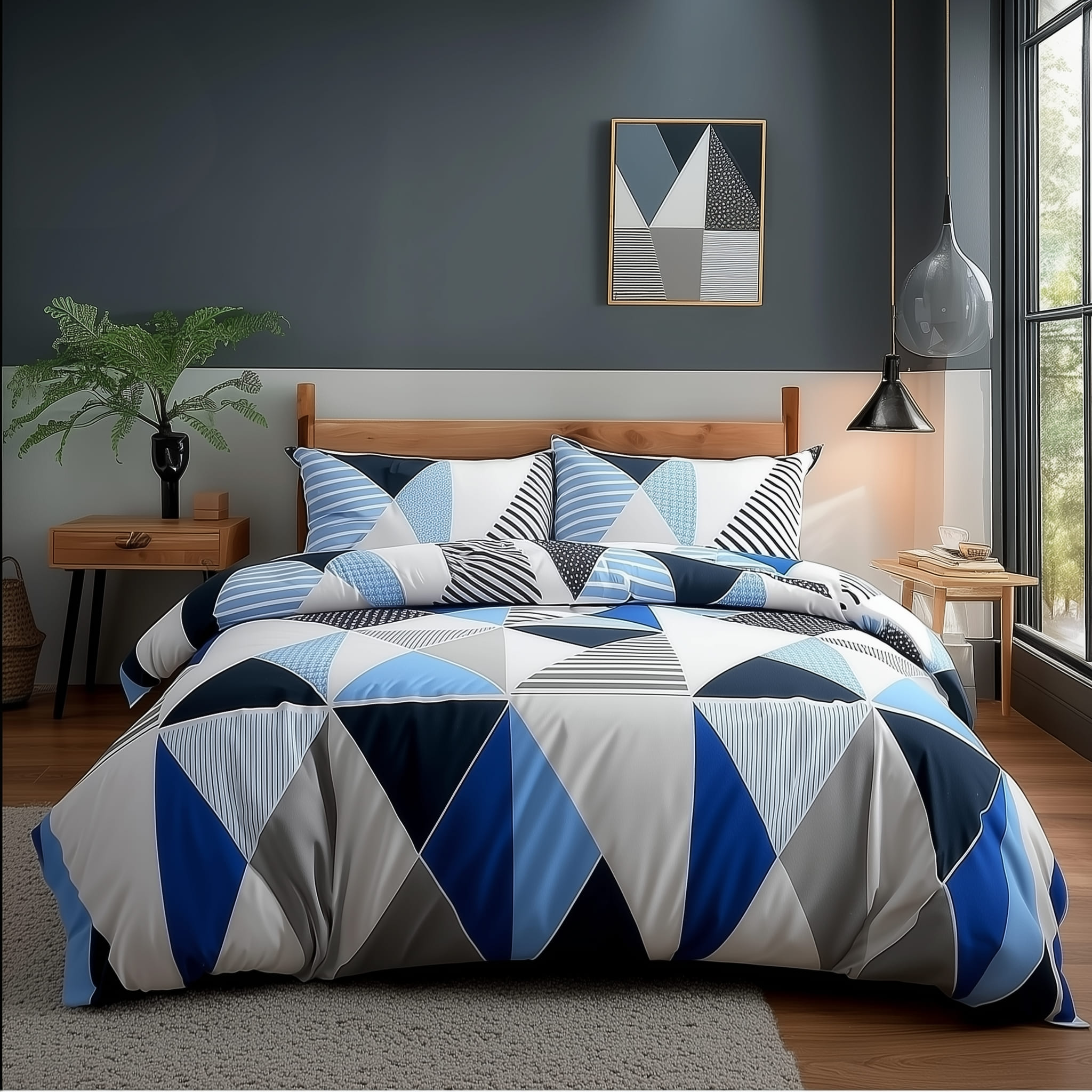 Brighten your bedroom with our Multi-Colour Triangle Duvet Cover Set. Made from soft, durable polycotton, this stylish bed linen adds comfort, color, and a modern geometric design.