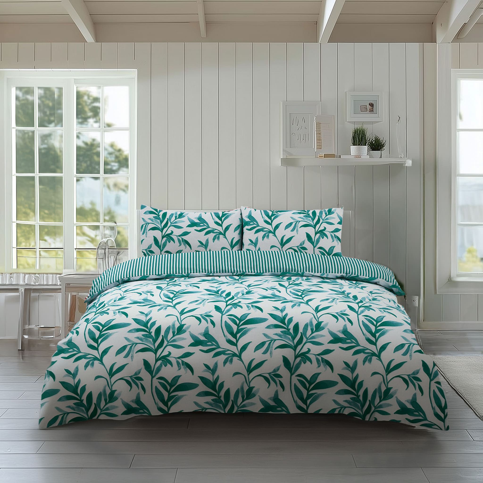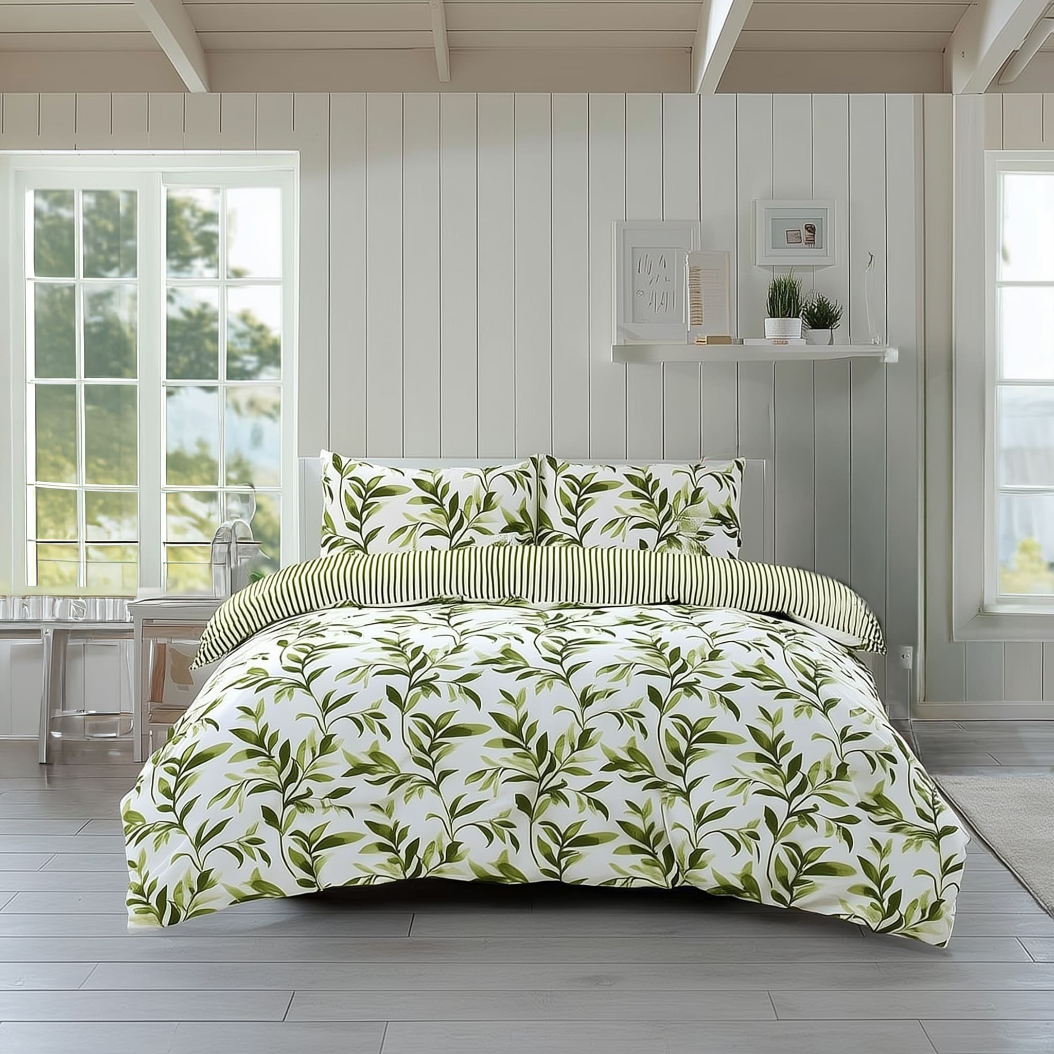 Duvet Cover And Pillowcase Set Reversible Leaf And Stripe Design Polycotton Bed Linen