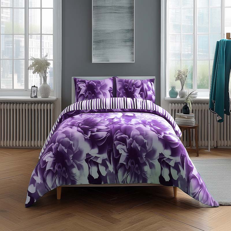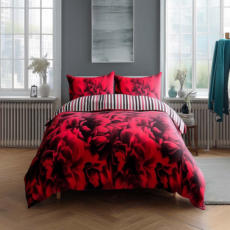 Duvet Cover And Pillowcase Set Reversible Rose And Stripe Design Polycotton Bed Linen