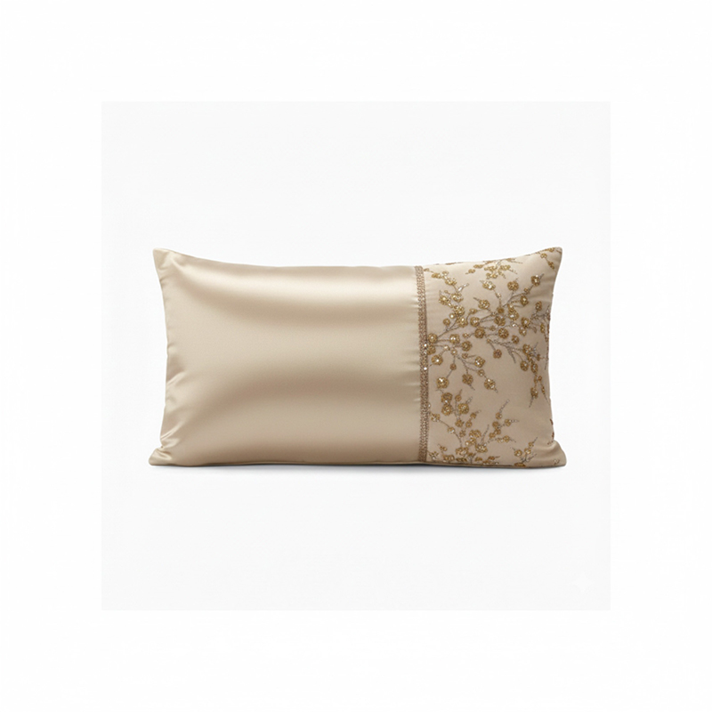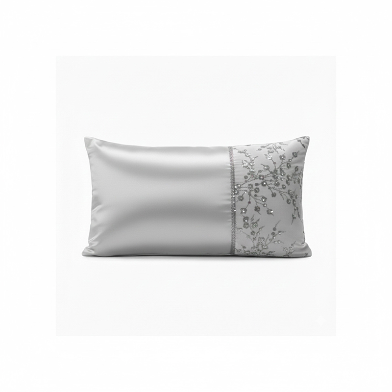 Add a touch of elegance to your living space with this luxury embellished oblong cushion, designed to elevate both modern and classic interiors. Crafted with a smooth satin-effect fabric, this decorative cushion features a beautifully detailed embroidered panel with delicate embellishments, creating a refined and sophisticated look.